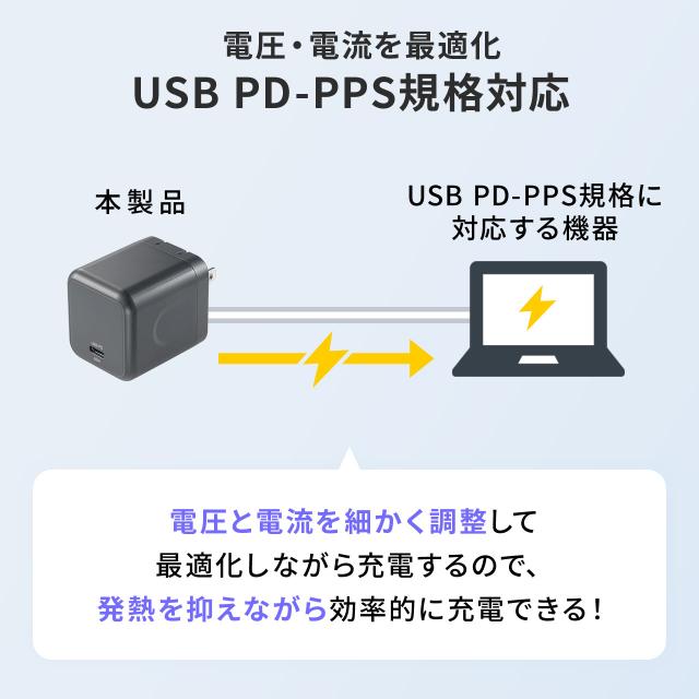 ●USB PD-PPS規格の出力に対応し、PPS規格対応機種の充電においては充電中の電圧と電流を細かく調整し最適化することで、発熱を抑えながら効率的に充電することができます。