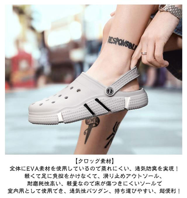 | 【クロッグ素材】全体にEVA素材を使用しているので蒸れにくい、通気防臭を実現!軽くて足に負担をかけなくて、滑り止めアウトソール、耐磨耗性高い、軽量なので床が傷つきにくいソールで室内用として使用でき、通気性バツグン、持ち運びやすい、超便利! 【柔軟性】ちょうど良い硬さで、ソールも柔らかくて、靴底のクッション性や弾力性が非常に良く、履いて動いていても疲れにくく、とても良い履き心地です。 【防滑】靴底には滑り止めの効果があり、雨の日にも滑りにくい。屈曲性や滑り止め性能が高い.進化したデザインにより、室内にを限らず、外出への使用性が更にUPした定番 ! 【フィット感・速乾性】軽い履き心地と快適なクッション性を実現!空気と水が通り抜けるポートがあり、速乾性抜群! 【2wayで着用可能】スリッパとサンダルの両用デザイン、軽量で通気性バツグン!持ち運びも容易で、超便利!ストラップは踵に掛けても、前面のアクセントにしても!自宅・オフィス・社内で履き替え用・雨の日・お散歩・お買い物・旅行・海・川・ベランダ・庭仕事に適用。 | |