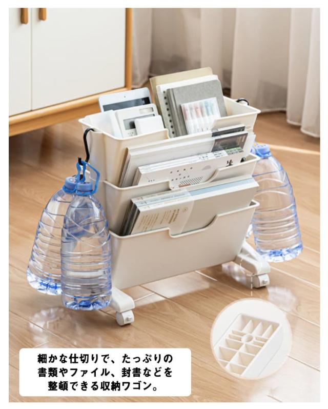 | 実用性とデザイン性に兼ね備えたファイルワゴン 細かな仕切りで、たっぷりの書類やファイル、封書などを整頓できる収納ワゴン。 仕切り板が斜めに設置されるので、背表紙が見やすくファイルなどが取りやすい構造です。 部屋に散らばりがちな雑誌や紙類の収納に便利。 テーブル下だけでなく、ダイニングテーブル下や座卓の近くなど、場所を問わず活躍。 選べるキャスタータイプ、スムーズに移動できて便利!ブレーキ付きにも安心してお使いいただけます。 工具いらずの簡単組み立て!組み立ては各パーツを差し込むだけ。女性でも簡単に組み立てできます。 実用的ながらオシャレでシンプルなデザインは、さりげないインテリアとしても優れものです。 | |