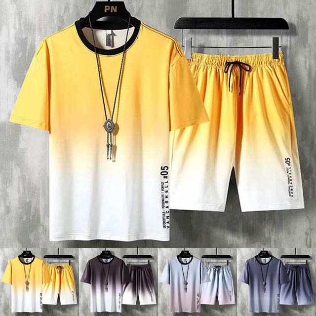 Tシャツ パンツメンズ 2点セット 半袖 丸首 グラデーション シンプル メンズTシャツ ゆったり 上下着 半袖Tシャツ 大きいサイズ 4色選ぶ