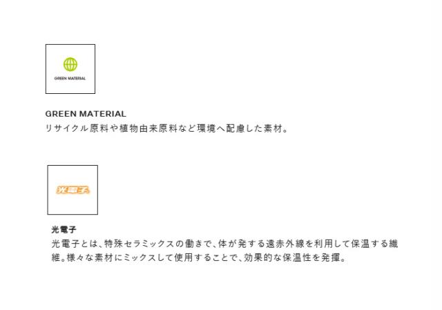テクノロジーとして採用している光電子は、着る人自身の体温(人体から放出される遠赤外線)によって生み出される自然な暖かさが持続するのが特長。