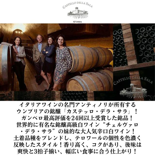 イタリアワインの名門アンティノリが所有する ウンブリアの銘醸「カステッロ・デラ・サラ」! ガンベロ最高評価を24回以上受賞した銘品!世界的に有名な銘醸高級白ワイン“チェルヴァロ ・デラ・サラ”の妹的な大人気辛口白ワイン!土着品種をブレンドし、テロワールの個性を色濃く反映したスタイル!香り高く、コクがあり、後味は爽快と3拍子揃い、幅広い食事に合う仕上がり!