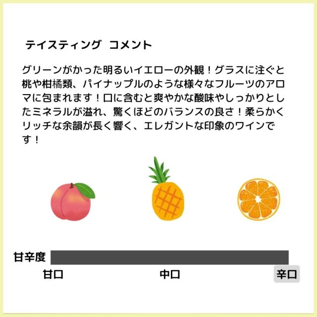![]() ■ぶどう品種:グレケット、プロカニコ、トレッビアーノ、ピノ・ビアンコ、ヴィオニエ ■発酵・熟成:温度管理されたステンレスタンクで発酵したのち、沈んだ澱とともに数ヵ月間タンク内で熟成 ■土壌:化石などの堆積物と粘土質の多い土壌 ■収穫:成熟度にこだわり、糖度が平均以上になるまで熟すのを待って収穫 ■標高:220~470m ■気候:夏は暑く乾燥し、冬は寒く湿気が多い 世界的に有名な銘醸高級白ワイン“チェルヴァロデラサラ”の妹的な白ワイン!土着品種をブレンドし、テロワールの個性を色濃く反映したスタイル!香り高く、コクがあり、後味は爽快と3拍子揃い、幅広い食事に合う仕上がり! グリーンがかった明るいイエローの外観!グラスに注ぐと桃や柑橘類、パイナップルのような様々なフルーツのアロマに包まれます!口に含むと爽やかな酸味やしっかりとしたミネラルが溢れ、驚くほどのバランスの良さ!柔らかくリッチな余韻が長く響く、エレガントな印象のワインです! イタリアの土着品種を用いた、香り・コク・爽快感と三拍子揃った、幅広い食事に合う一本!偉大なるチェルヴァロデラサラの妹的存在の辛口白ワイン!コストパフォーマンスに優れた逸品をぜひ一度お試しください! |