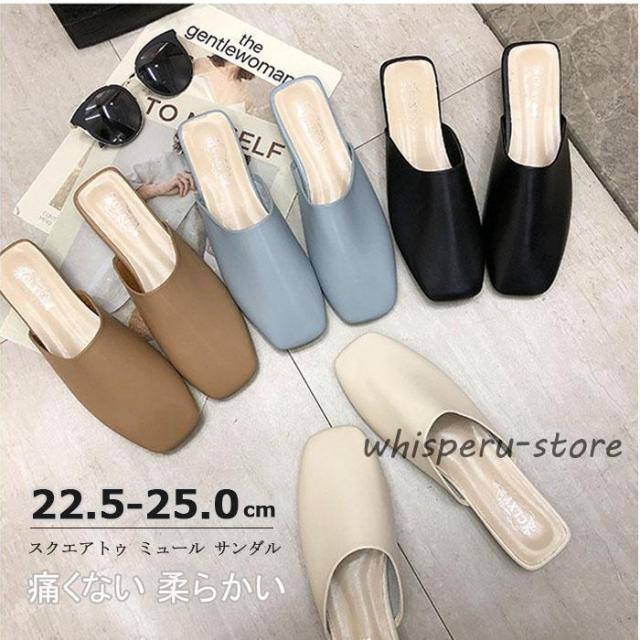 スクエアトゥ ミュール サンダル ぺたんこ レディース フラット 痛くない柔らかい ブラック 春夏秋冬 黒 スリッパ 低反発 22.5 23.0 23.5 24.0 24.5 25.0cm 大さ