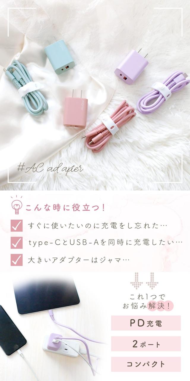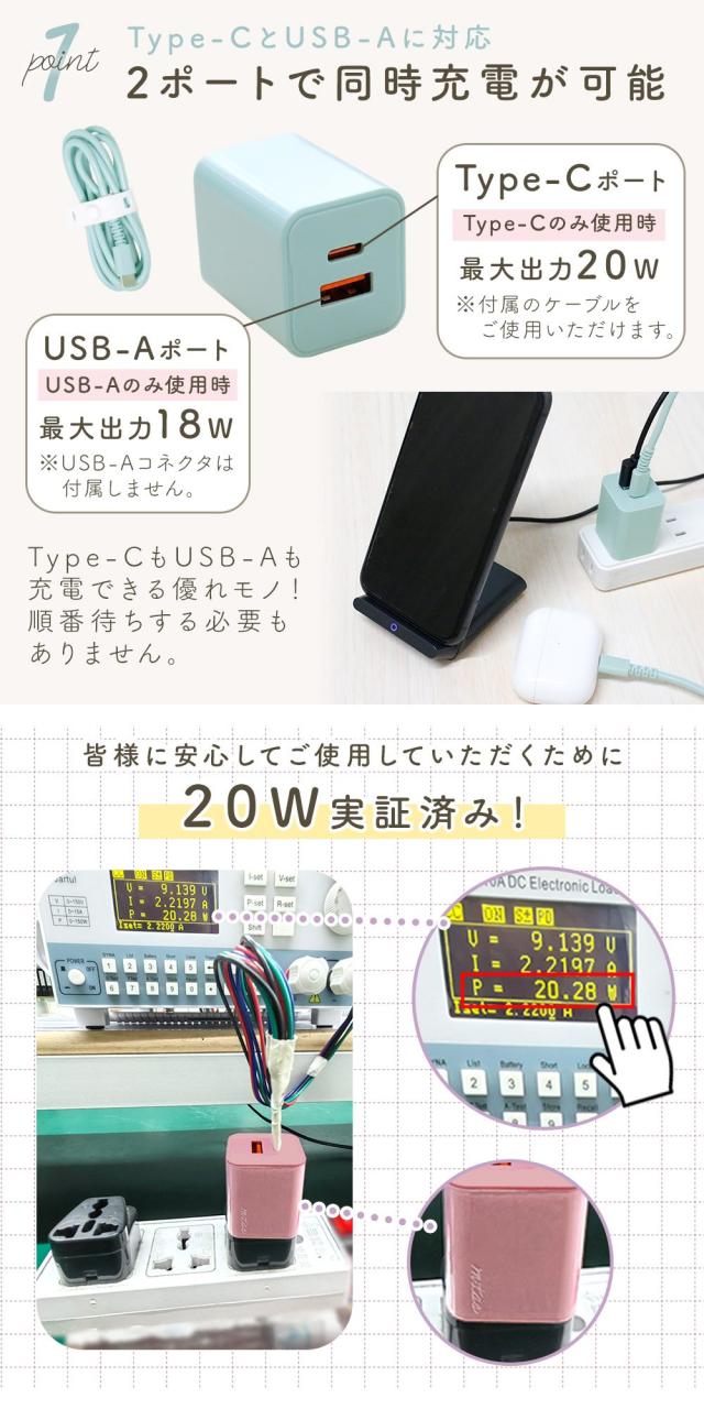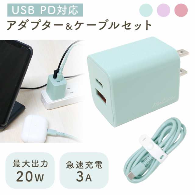 【mitas公式】くすみカラー USB充電器 PD 急速 Type-C ケーブルセット ACアダプター 2ポート タイプc Type-A 20W 2口 チャージャー PSE認証 コンセント AC充電器 スマホ スマートフォン タブレット iphone android タイプA 正規品 コンパクト 持ち運び 電源アダプタ 軽量