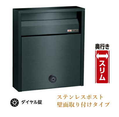 奥行のスリムな郵便受け箱(ポスト)。壁面取付け専用タイプ ステンレス ポスト 郵便 受け ボックス 事務所 会社 ダイヤル 鍵 付き 防犯 壁 付け 掛け ブラック 黒 シンプル デザイン