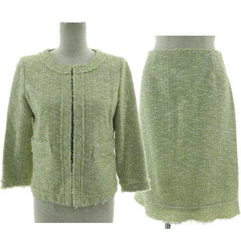 【中古】シップス スーツ フォーマル ジャケット ノーカラー スカート ミディ丈 フリンジ ツイード ?緑 オフ白 M