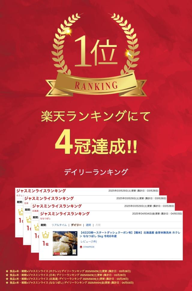 | 商品の説明 | 一般財団法人日本穀物検定協会の食味ランキングで「特A」評価を獲得した「北海道産ななつぼし」。 その品種に特別な製法である「金芽米」加工し、無洗米として食味が向上したこだわりの商品です。 その濃厚な味わいを是非ご賞味ください。 ※カビや虫害などを避けるため、高温多湿な場所での保管は避けて下さい。 ※臭いが付きやすいので、洗剤・芳香剤・化粧品等の側には置かないで下さい。 |