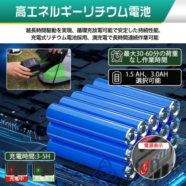 電動芝刈機は、3.0Ahの大容量バッテリー1個を搭載しており、バッテリーには電量表示灯が付いており、残りの電量をリアルタイムで監視できます。