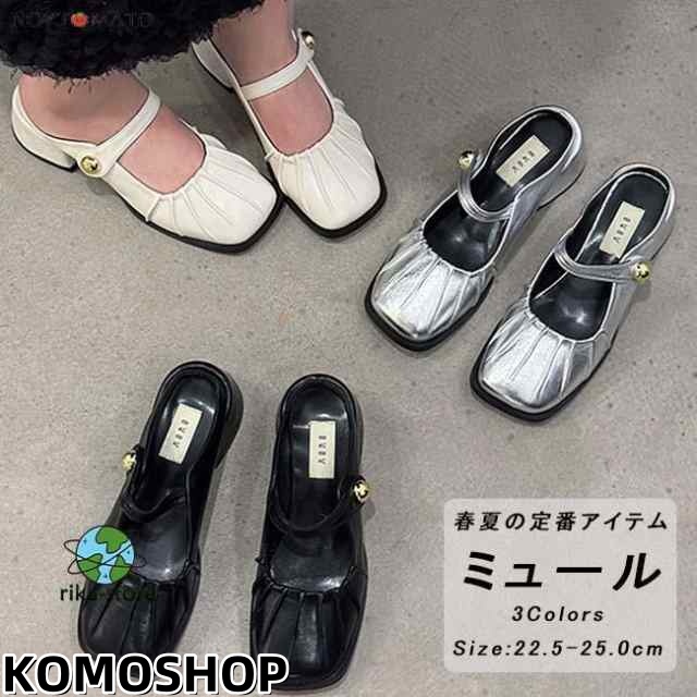 ミュールパンプス レディース ミュールサンダル スクエアトゥ 太めヒール パンプス かかとなし ストラップ カジュアル 履きやすい 歩きやすい おしゃれ シルバー
