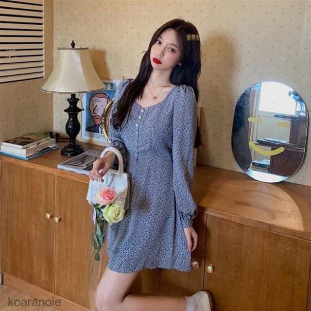 ワンピース 長袖 レディース 柄ワンピ ミニ丈ワンピース 花柄 長袖ワンピース 薄手 スクエアネック レトロ サマーワンピース ショートワンピ