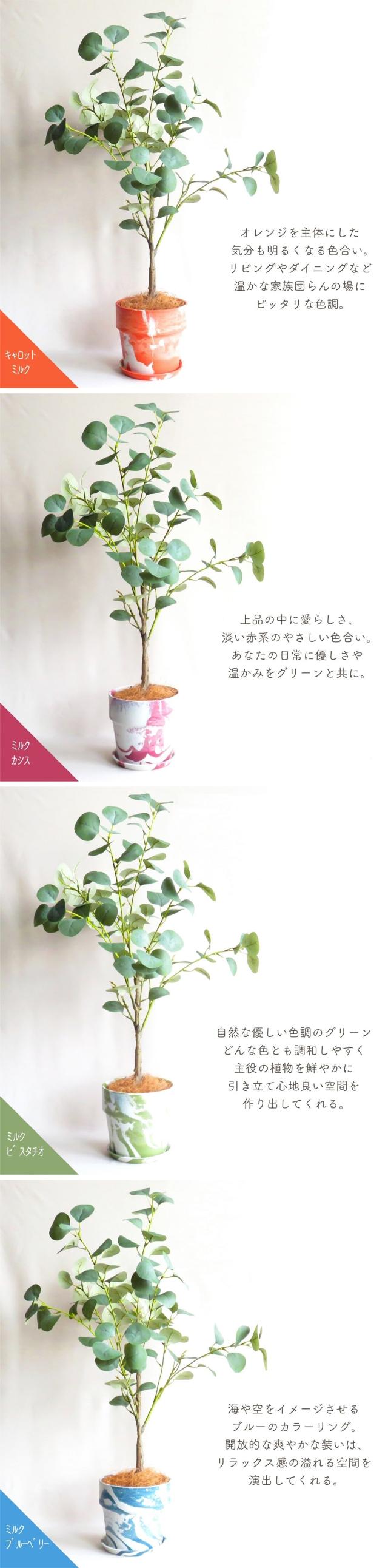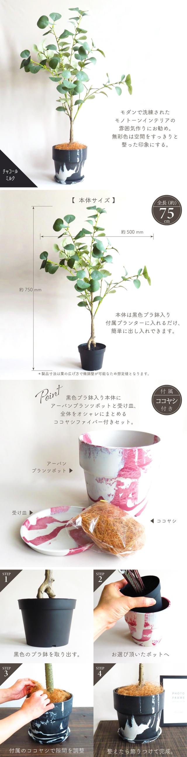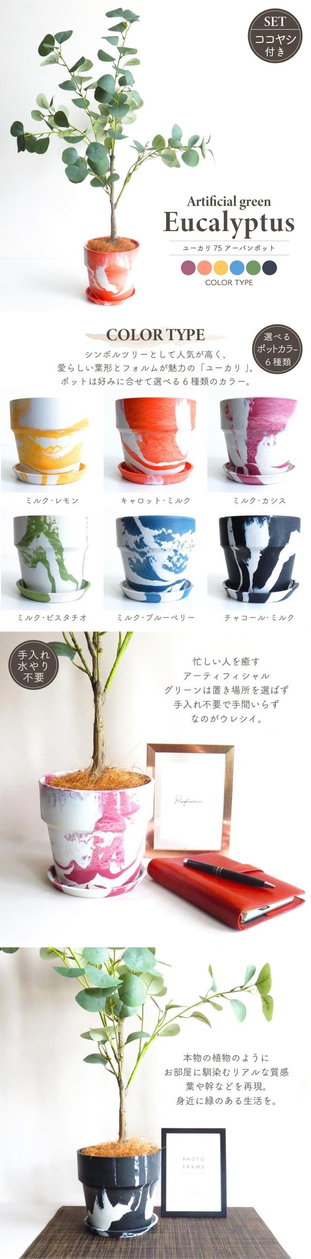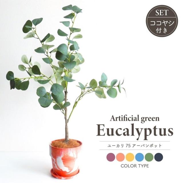 人工観葉植物 アーティフィシャルグリーン ユーカリツリー75 アーバンプランツポット ココヤシ付きセット 選べるカラータイプ6種類 全高75cm ペイント柄 受け皿付き 造花 フェイクグリーン インテリアグリーン コーディネート 鉢物 観葉植物 贈り物 インテリア