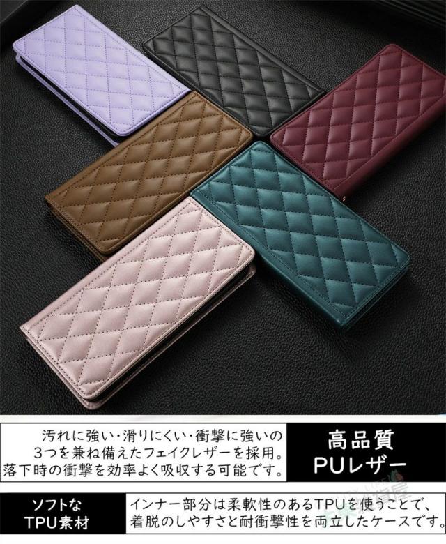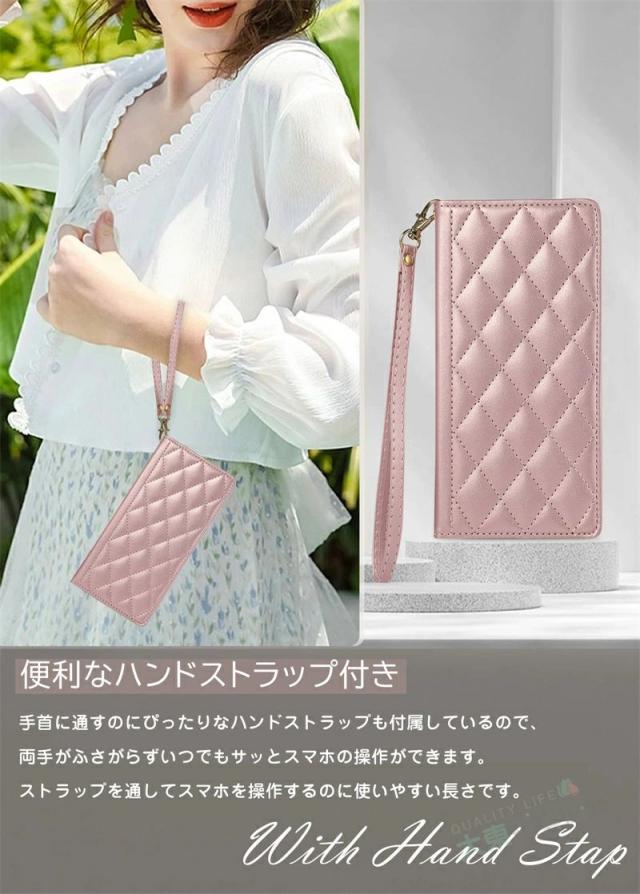 ?取り外し可能ハンドストラップ付属の キルティングレザー スマホケース。