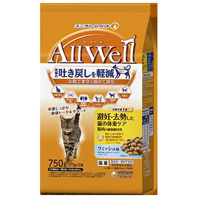 【3個セット】ユニ・チャーム AllWell避妊・去勢した猫の体重ケア筋肉の健康維持用フィッシュ味挽き小魚とささみFDパウダー入り750g