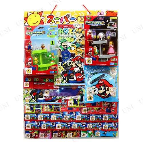| 商品説明 | スーパーマリオの玩具が30個付いた豪華な当てくじ!引いた番号の商品がもらえる台紙くじタイプ。景品には番号シールがついているのですぐに遊べます。子供会や自治会、バザーやパーティーなどで盛り上がるイベントです。お子様向け店舗販促品としてもおススメ! ※景品は随時変更されます。予めご了承ください |