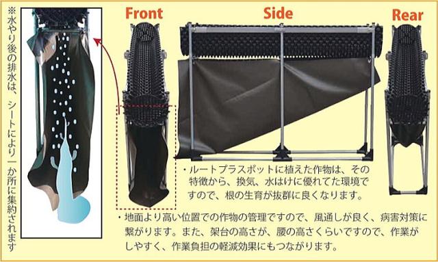 | ・高設架台にて、空気の流れが良いので、病害対策になります。また、腰ほどの高さのため、作業の軽減になります。 |
