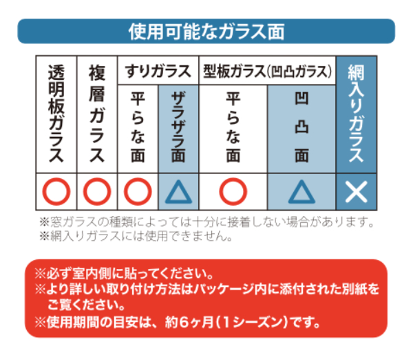 | 注意事項 | ※窓ガラスの種類によっては十分に接着しない場合があります ※網入りガラスには使用できません |