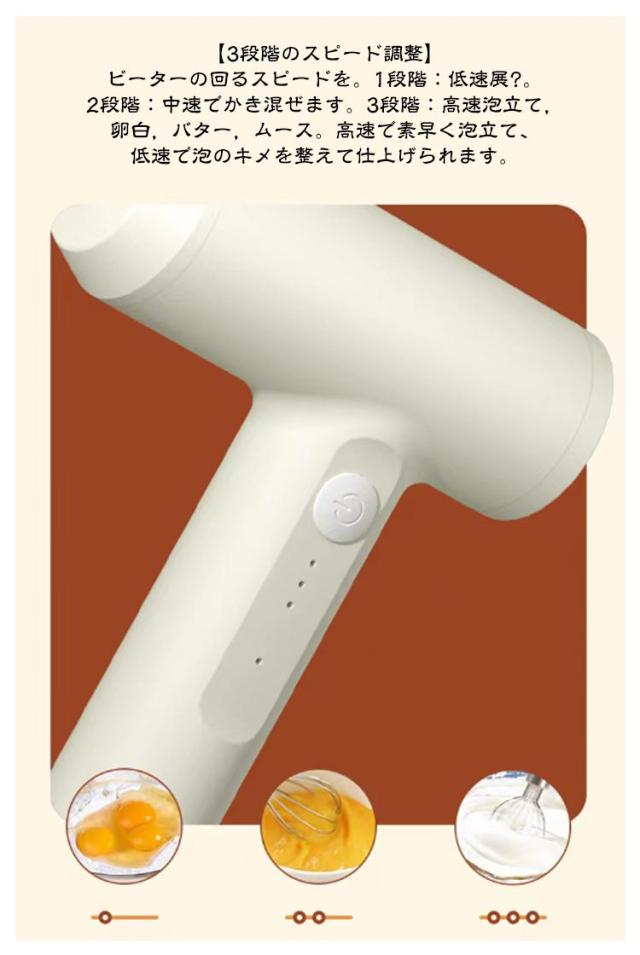 | 大中小3種類のウィスク付き USB充電式 3段階スピード調節 ハンドミキサー 【USB充電式&コードレス】 ●バッテリー:2000mAh充電式リチウムバッテリー、一回3時間充電だけで長く使用できます。コードレス設計、場所を選ばなくても使用できるので便利!!使いやすい!! 【3段階のスピード調整】 ●ビーターの回るスピードを。1段階:低速展?。2段階:中速でかき混ぜます。3段階:高速泡立て,卵白,バター,ムース。高速で素早く泡立て、低速で泡のキメを整えて仕上げられます。 【三つのミキシングビーター付属】 ●異なる材料使用のため、3つのミキシングビーターが付属しています。 304ステンレス鋼製。耐久性があり、安全に使用できます。ご注意すること:使用前に必ずミキシングビーターを洗浄して消毒してください | |