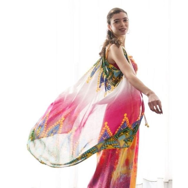 ステンドグラスのような透明感のあるチャイグラスをイメージしたUVパレオ。ベスト型にしたり、首に巻くストールとしても使える3WAY タイプ。肌触りが良いレーヨン素材は、乾きやすく通気性バツグンです。