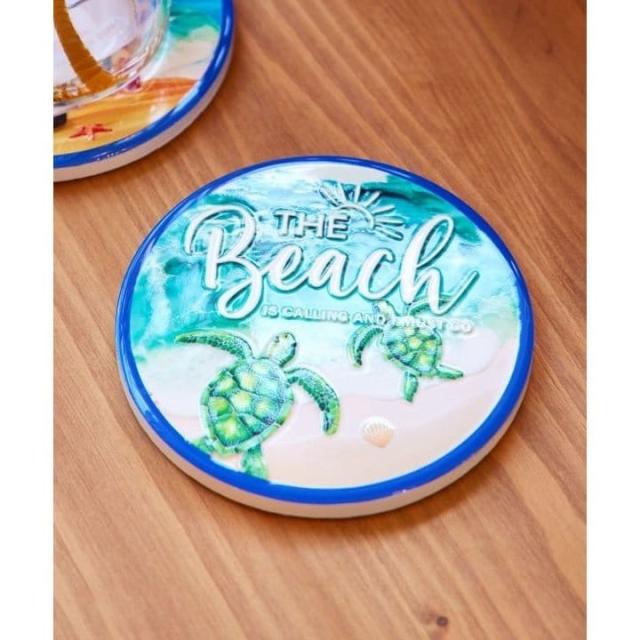 ハワイの美しい海の風景が描かれた陶器のコースター。インテリアとして飾りたくなるほどの美しさ。空と海のグラデーションが目を惹くデザインです。