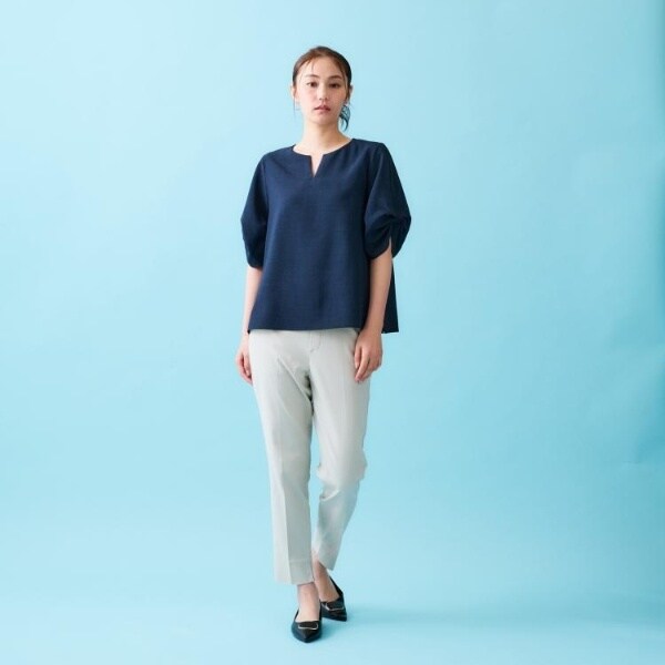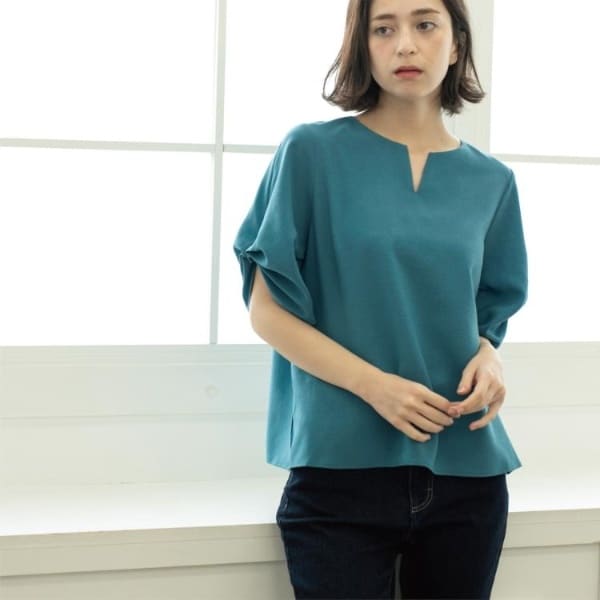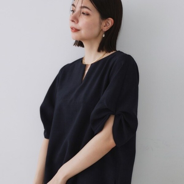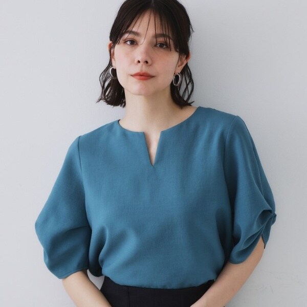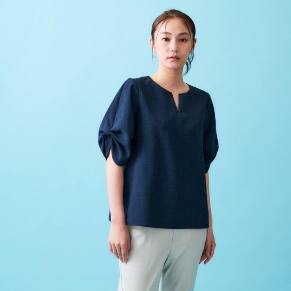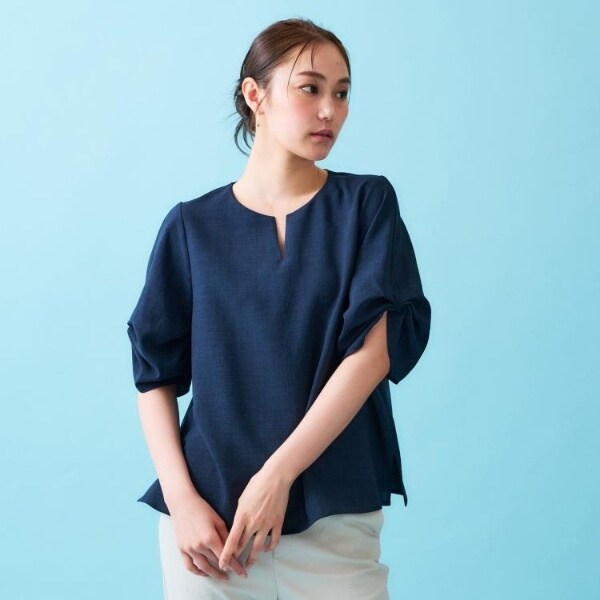 リネンライクキーネックタックスリーブブラウス【洗濯機洗い可吸水速乾接触冷感】