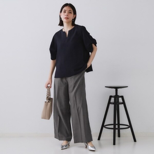 ・麻混素材のようなタッチが涼しげな、きれいめに着こなせるポリエステル素材。