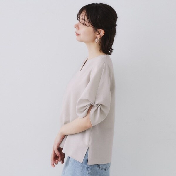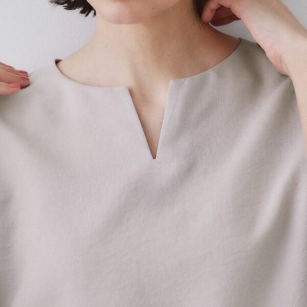 ・すっきりとしたキーネックの衿元と、ほどよくゆとりのあるボディ。