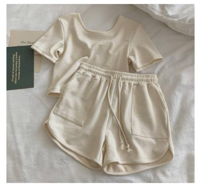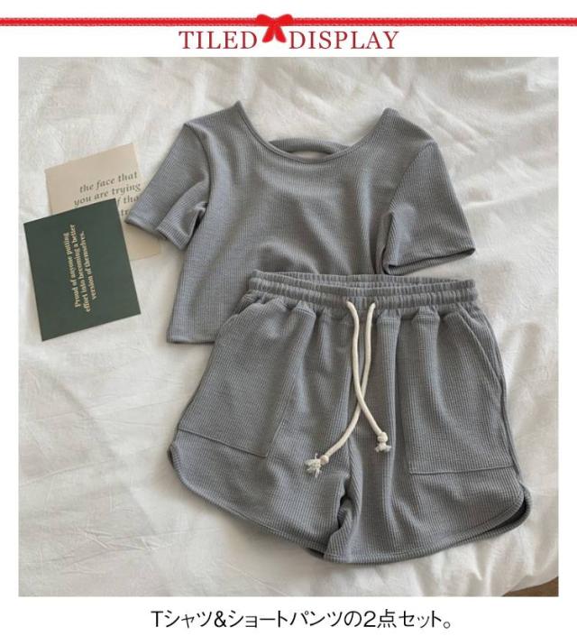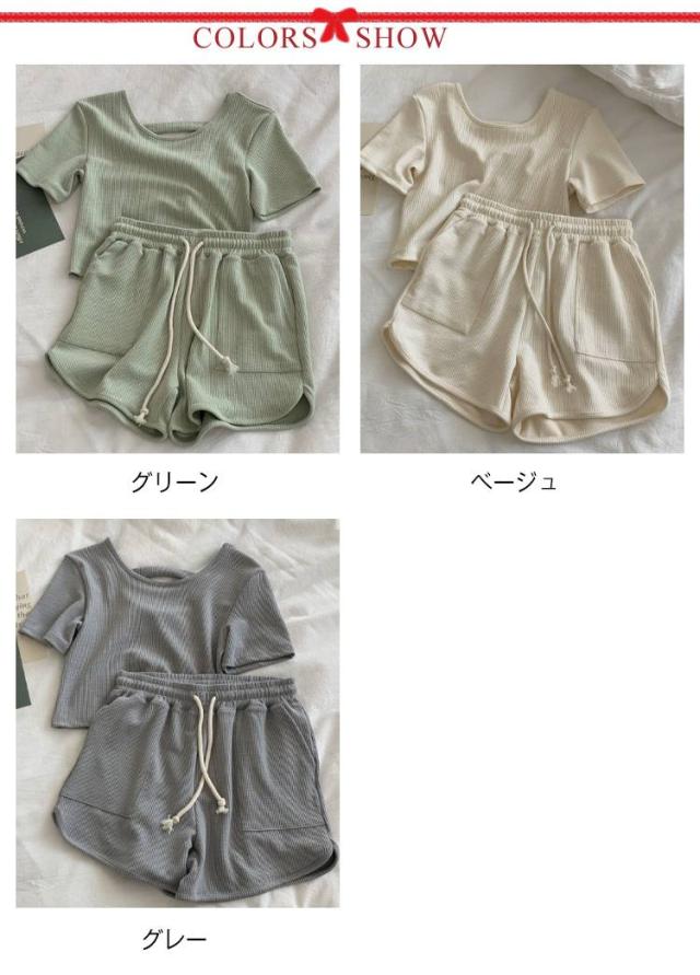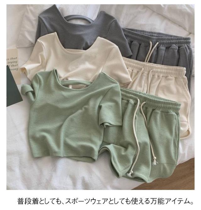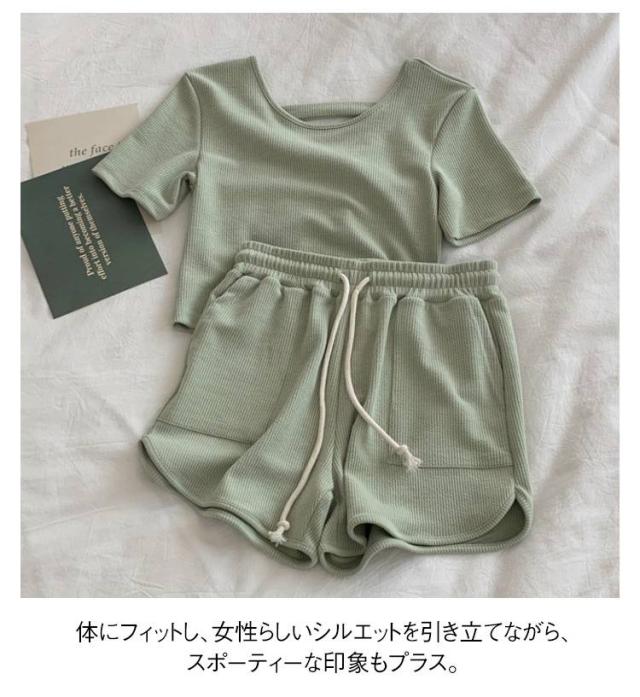 上下セット リブ セットアップ レディース セット ショートパンツ 薄手 シンプル 無地 半袖tシャツ セットアップ tシャツ 短パン ヨガ ランニング ジムトレーニング ルームウェア