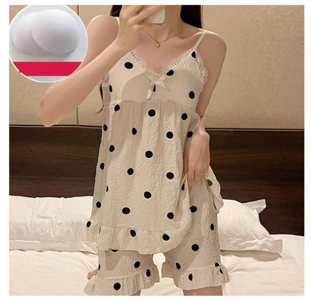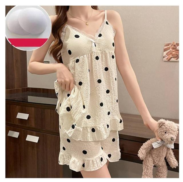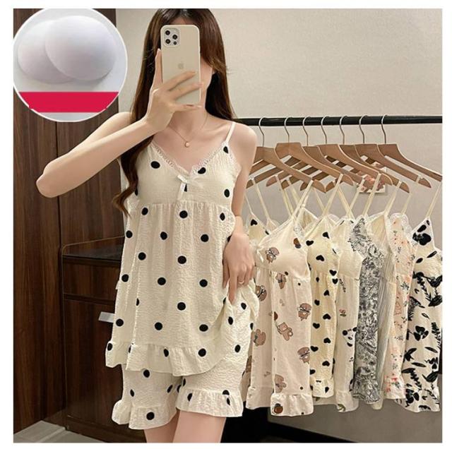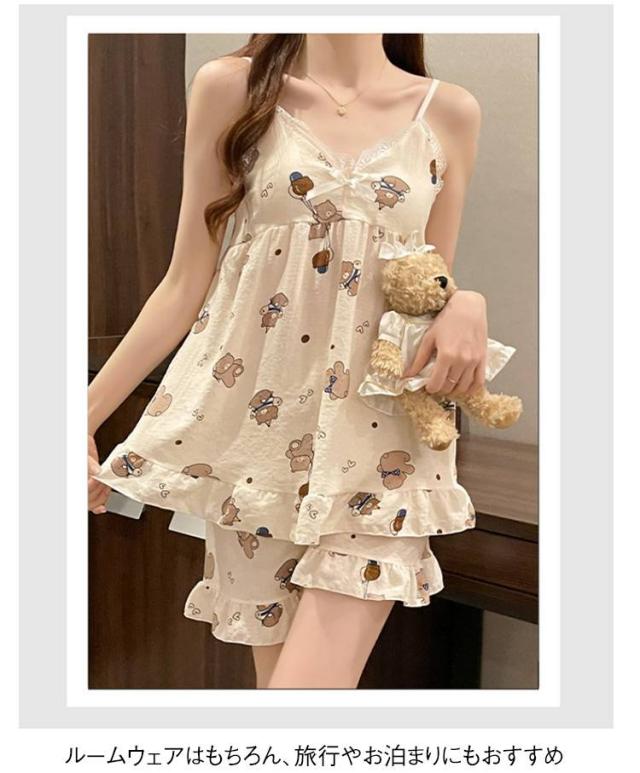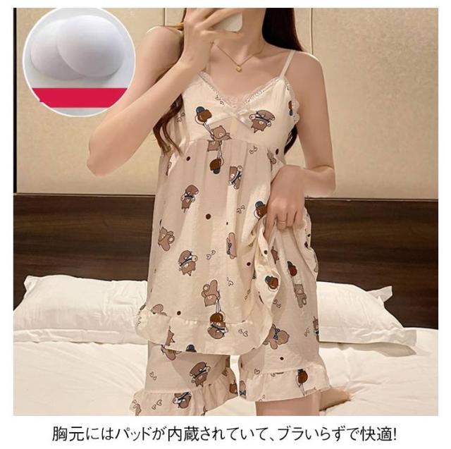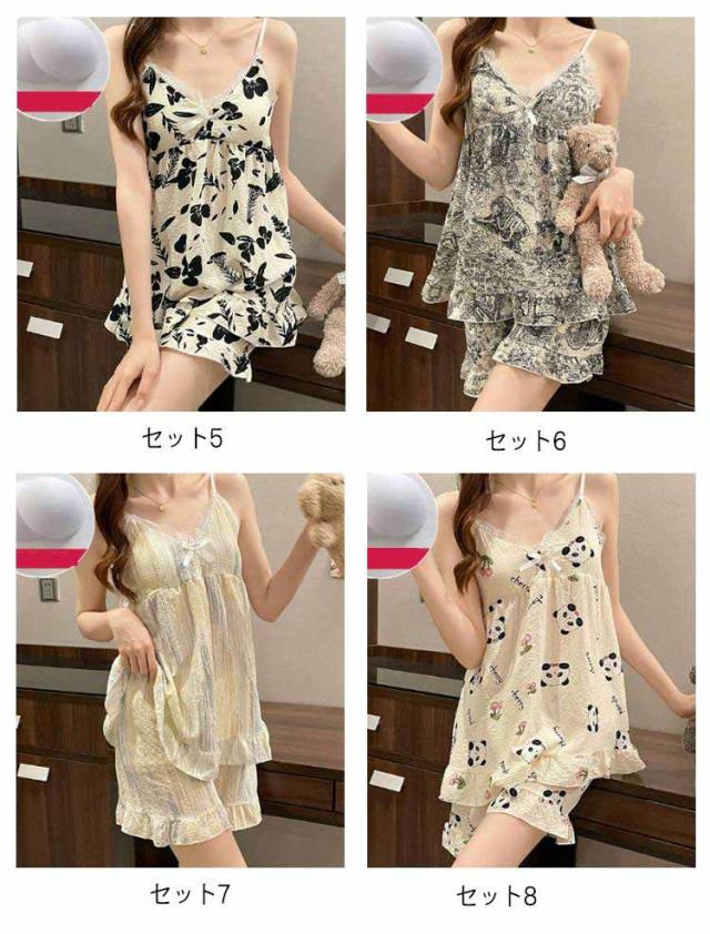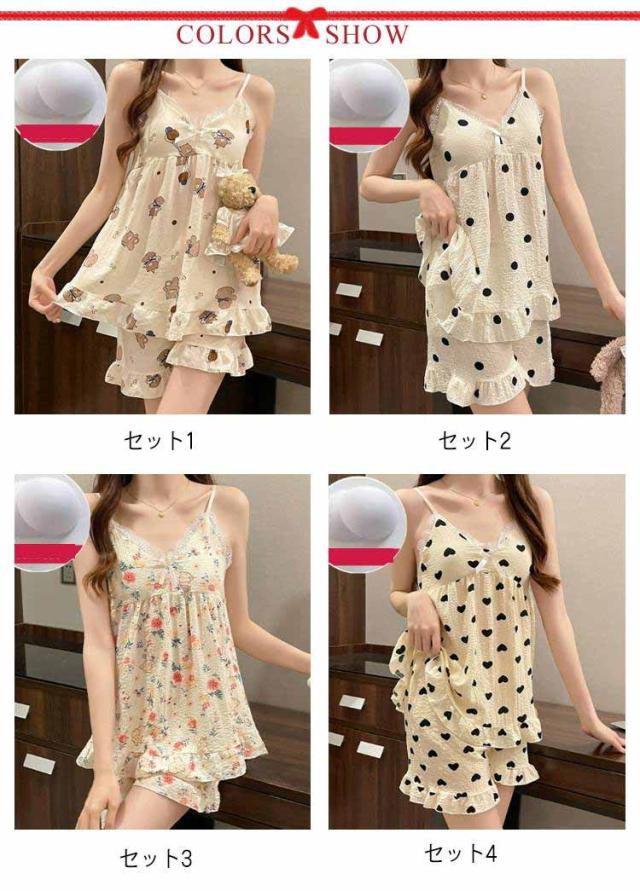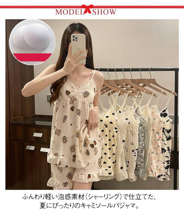 上下セット レディース 夏 キャミソール 部屋着 水玉 シャーリング素材 パジャマ かわいい キャラクター柄 20代 涼感 ルームウェア カップ付き パンダ フラワー ハート パジャマ 30代