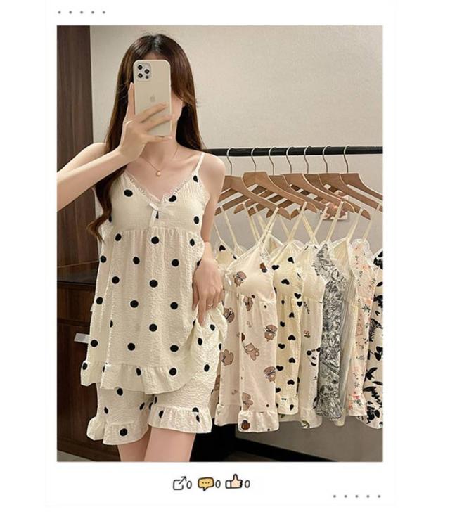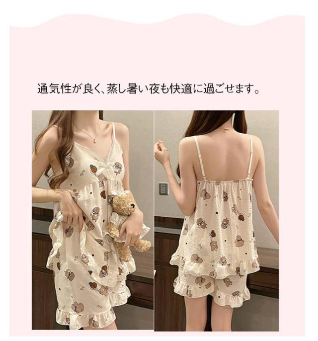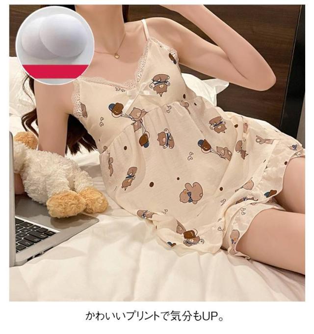 | ふんわり軽い泡感素材(シャーリング)で仕立てた、夏にぴったりのキャミソールパジャマ。 胸元にはパッドが内蔵されていて、ブラいらずで快適! かわいいプリントで気分もUP。 通気性が良く、蒸し暑い夜も快適に過ごせます。 ルームウェアはもちろん、旅行やお泊まりにもおすすめ◎ | |