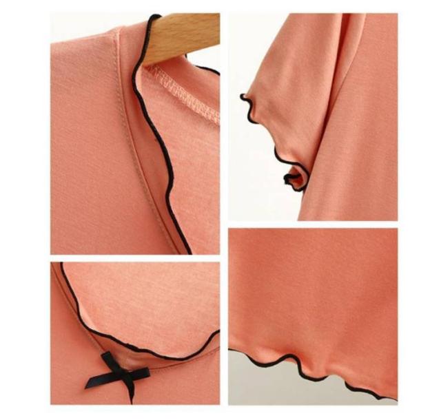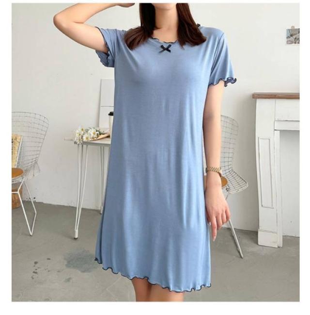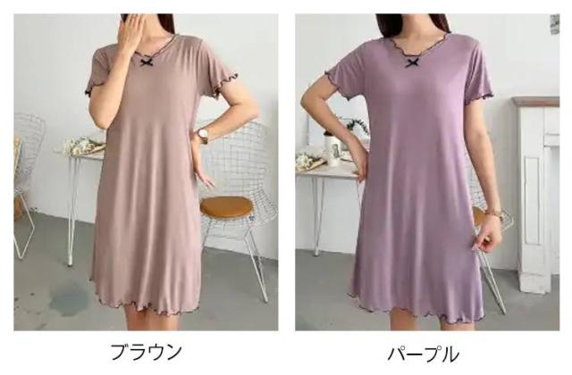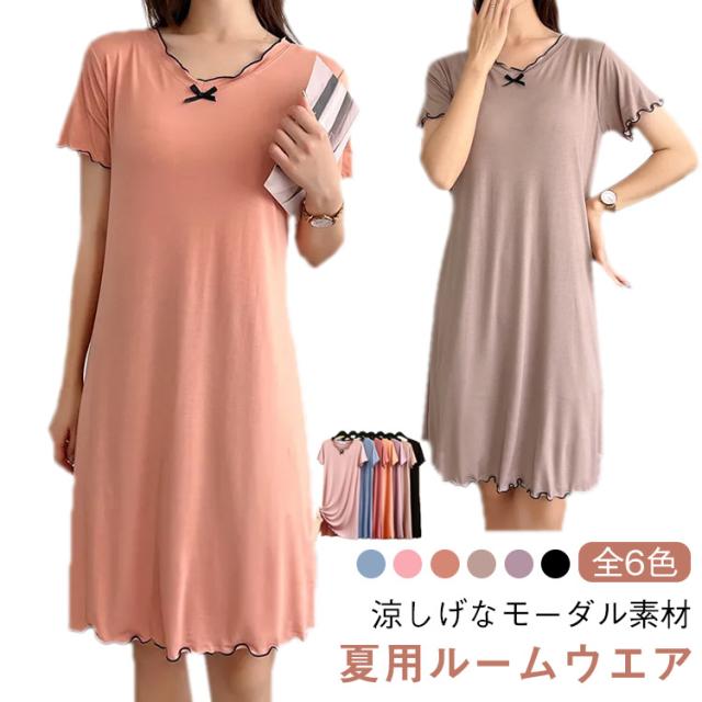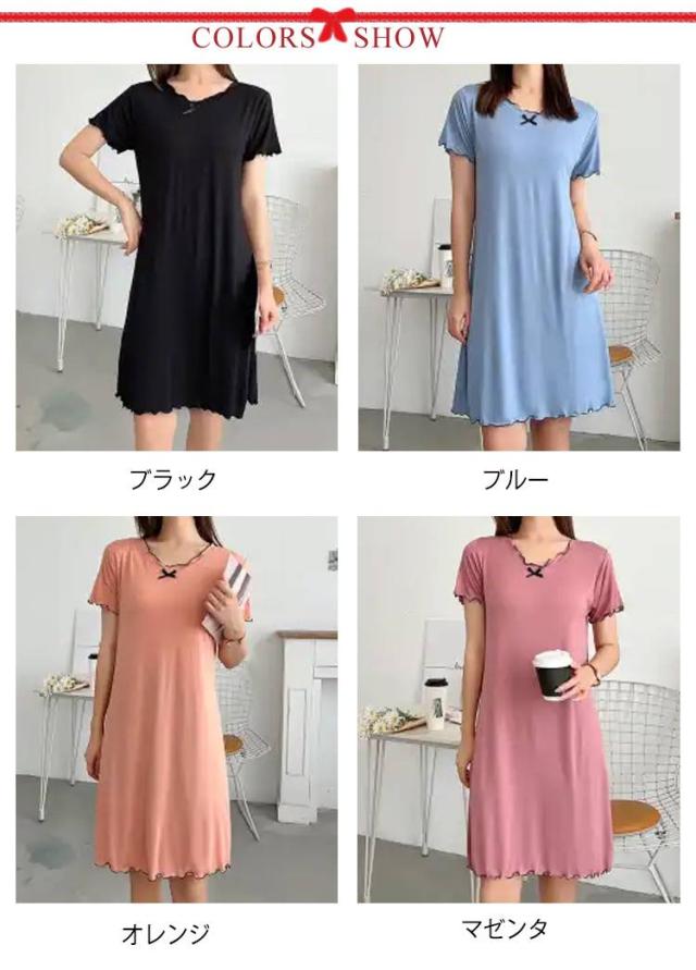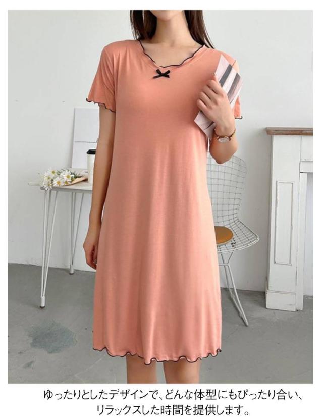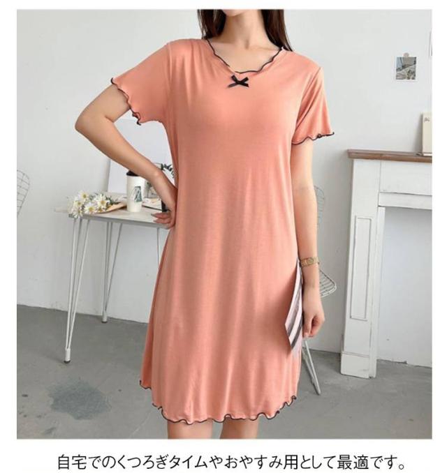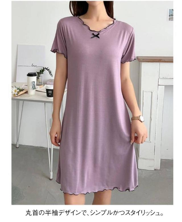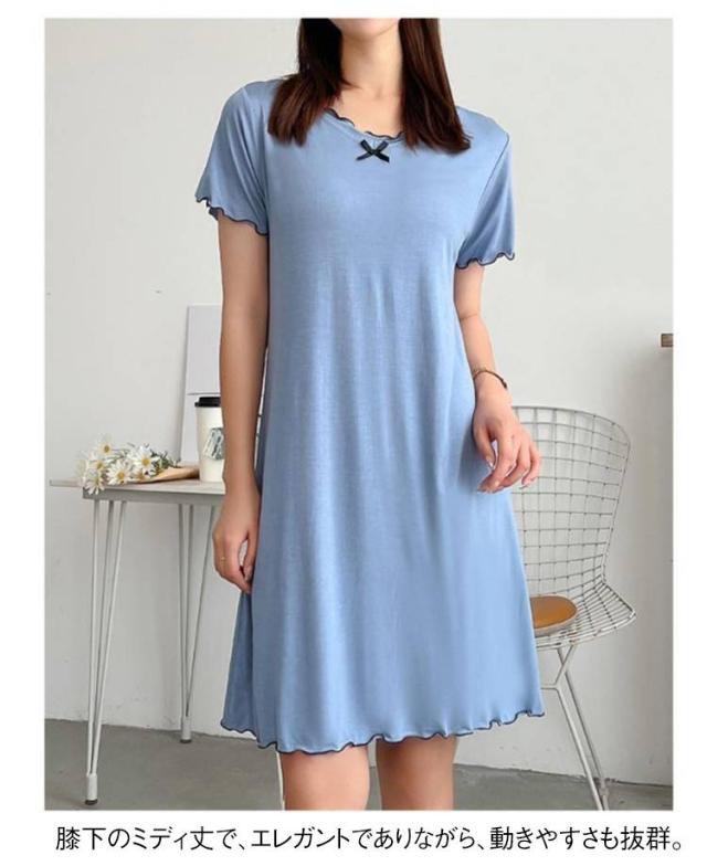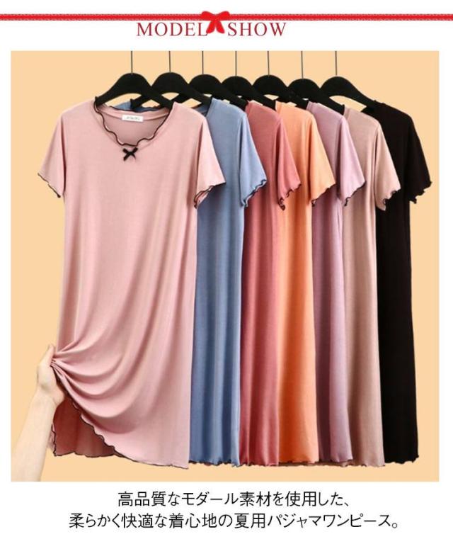 大きめサイズ モダールパジャマ 半袖 モダールパジャマ ゆったり 夏用 膝下 可愛い ルームウエア ミディ丈 ワンピース セットアップ パジャマ フリル 丸首 シンプル 無地 お休み用 リラックスウエア