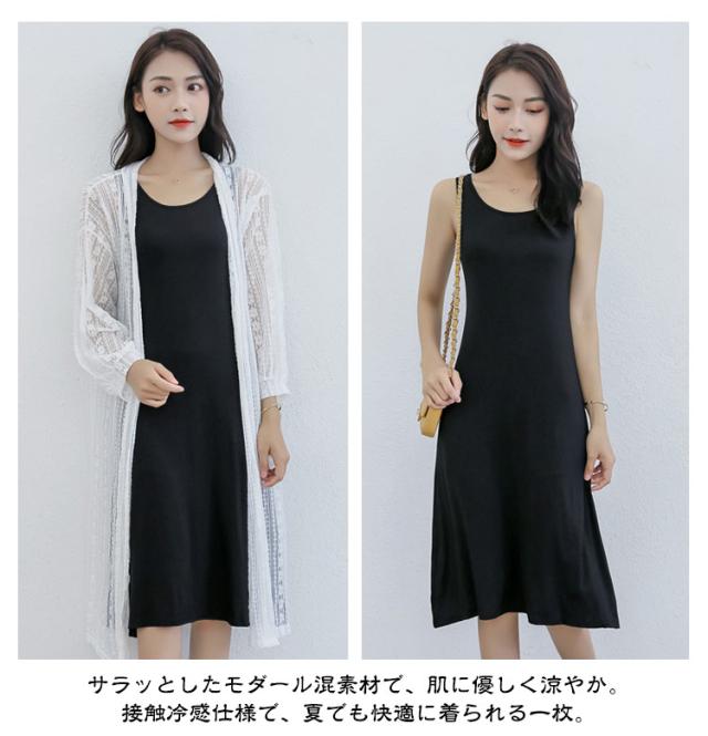 | M〜2XLサイズまで対応! ノースリーブ×タンクトップ風デザインで、下着の肩紐も隠れる安心設計。 サラッとしたモダール混素材で、肌に優しく涼やか。接触冷感仕様で、夏でも快適に着られる一枚。 Aラインのフレアシルエットが体型をふんわりカバー。ゆったりとした着心地で楽ちん&おしゃれ。 これ一枚で外出もお部屋もOK。ストレスフリーな着心地。 無地のシンプルデザインだから、カーディガンやシャツを羽織っても◎ レイヤードスタイルにも最適。 | |