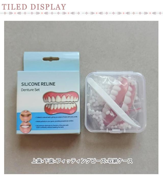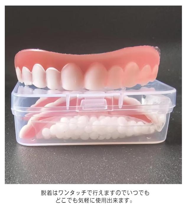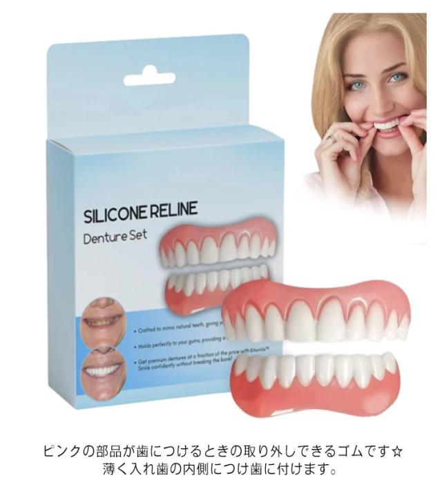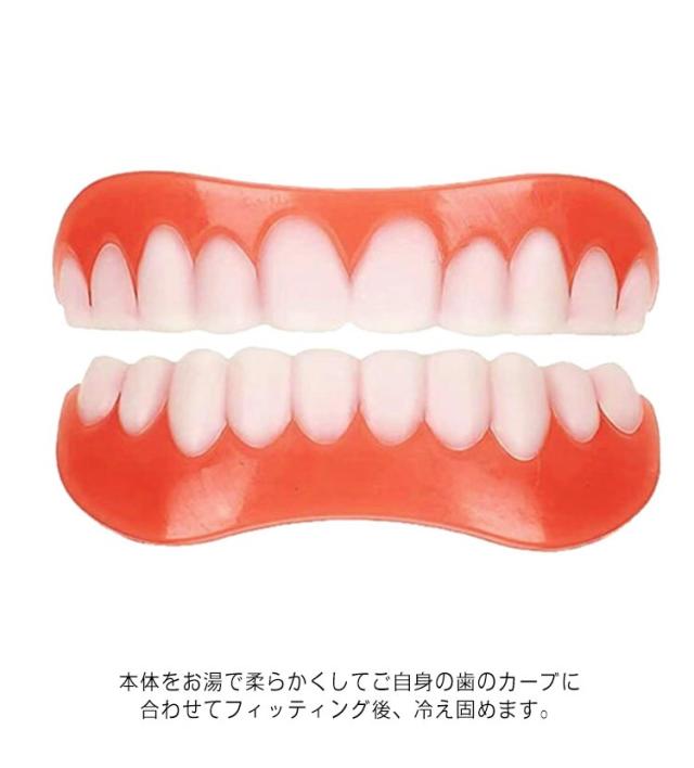 | 2組!上歯+下歯セット 脱着はワンタッチで行えますのでいつでもどこでも気軽に使用出来ます。 本体をお湯で柔らかくしてご自身の歯のカーブに合わせてフィッティング後、冷え固めます。 面接の時に、写真撮影時に、旅行に! お湯に2分つけ、ピンクの部品を柔らかくしてから自分の歯にあわせて形を作ってください♪ ピンクの部品が歯につけるときの取り外しできるゴムです☆ 薄く入れ歯の内側につけ歯に付けます。 そのゴムが自分の歯の隙間などに入り固定できます☆ うまくつかない場合は、市販されている歯接着剤をお使い下さい。 | |