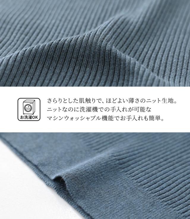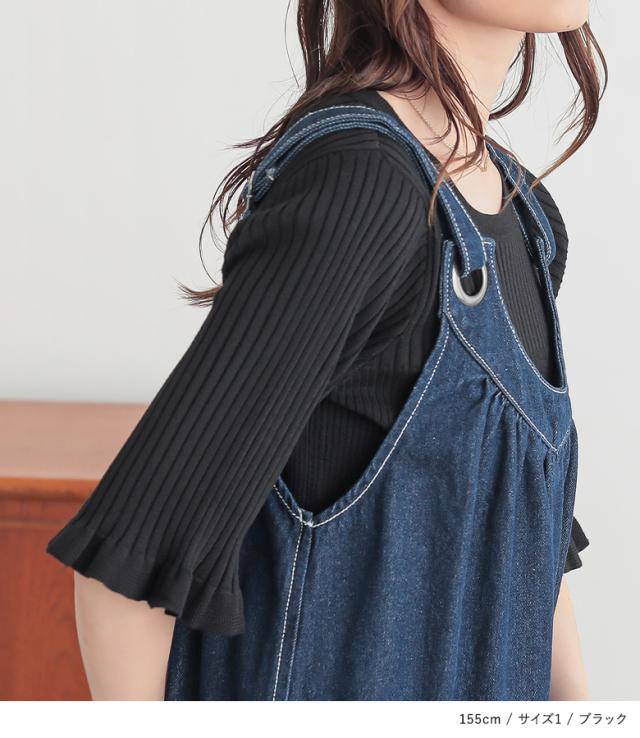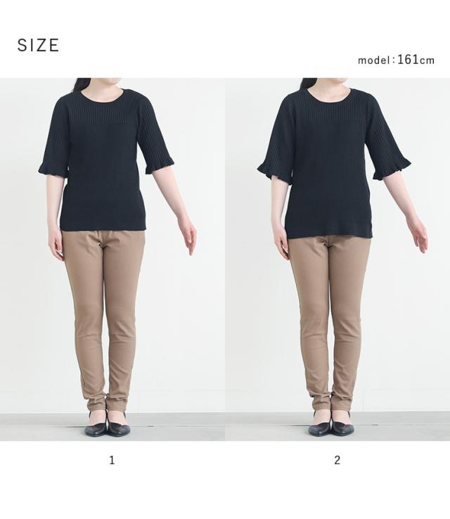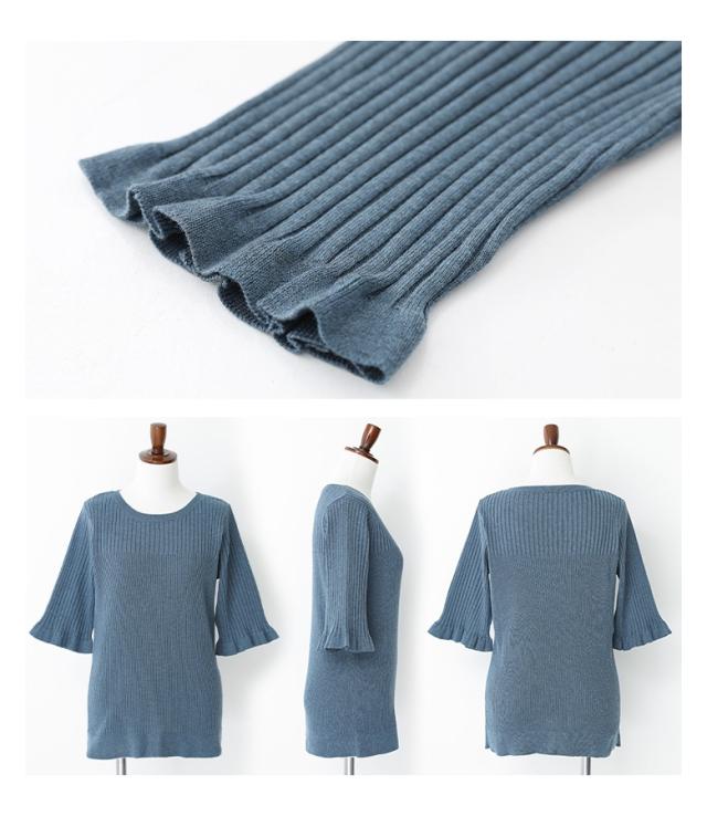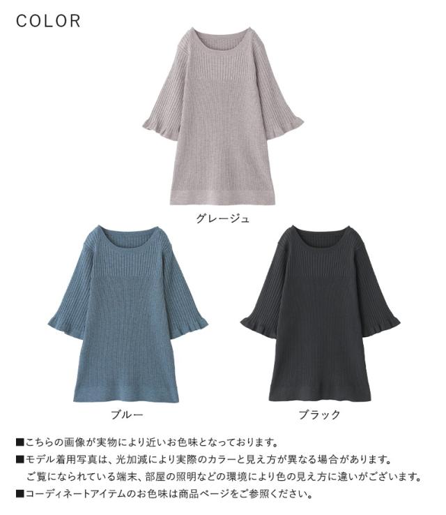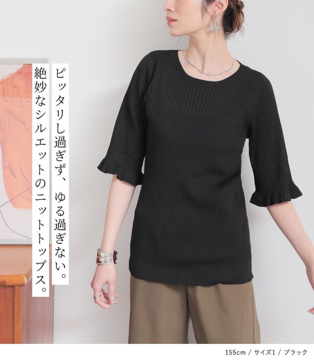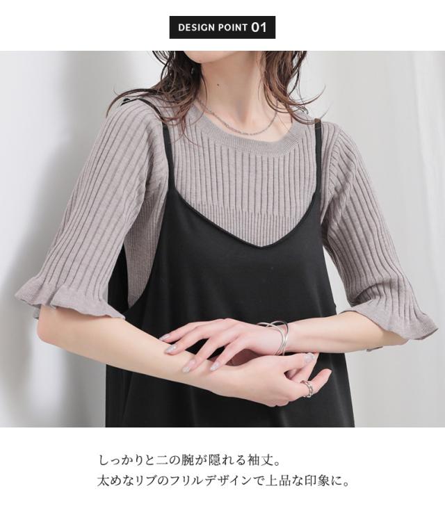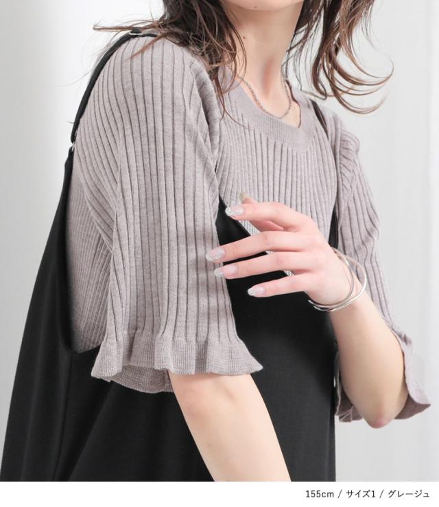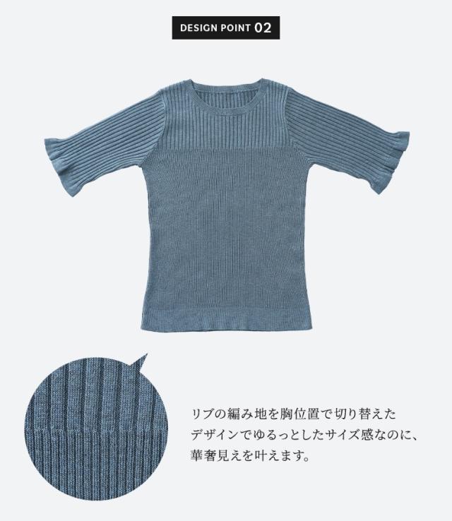 『nOrLABEL袖フリル半袖リブニット』※メール便可※【10】[ニット 半袖 五分袖 レディース トップス フリル袖 リブ編み 切り替え 体型カバー 二の腕カバー きれいめ マシンウォッシャブル 春 夏 秋]