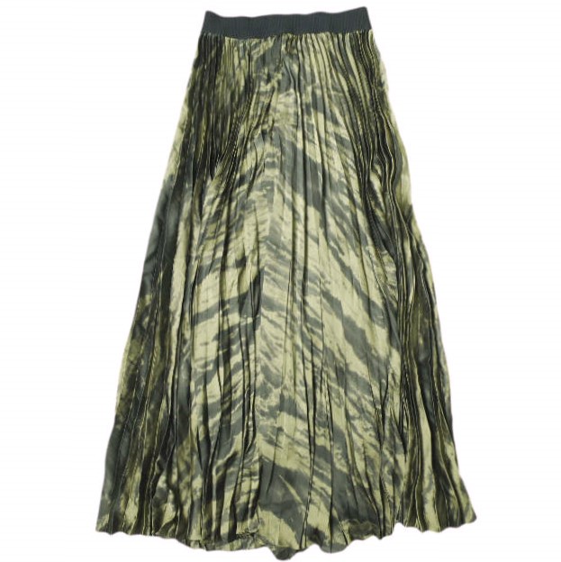 合繊生地に染色の様な総柄デザインを施したプリーツスカート。