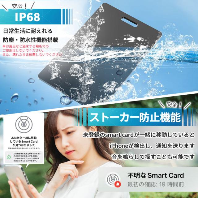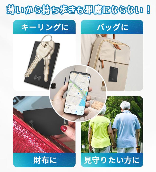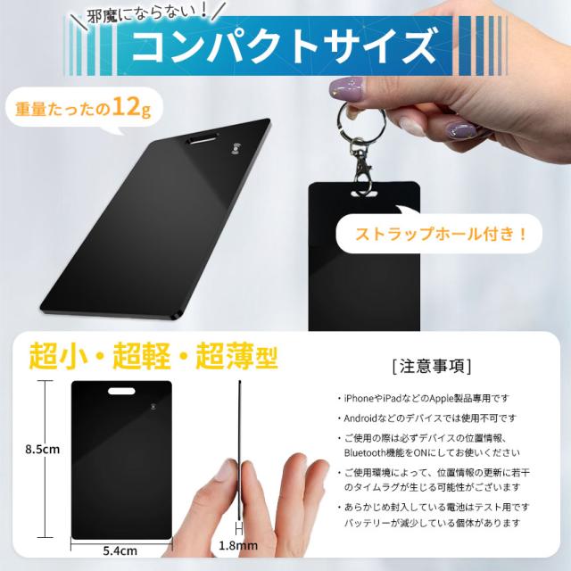 「探す」アプリで使えるカード型スマートタグAppleの「探す」アプリでご利用いただける紛失防止のスマートタグです。なくしたくない物につけるだけ!薄くて軽いタグなのでキーホルダーとして鍵や鞄につけたり、財布などに入れて持ち歩いても邪魔になりません。\こんな用途で使えて便利!/・財布や鍵につけて落とし物防止・キャリーケースにつけて旅行中の紛失防止・子供に持たせて通学の見守り・ペットの首輪につけて脱走予防・高齢者の迷子防止