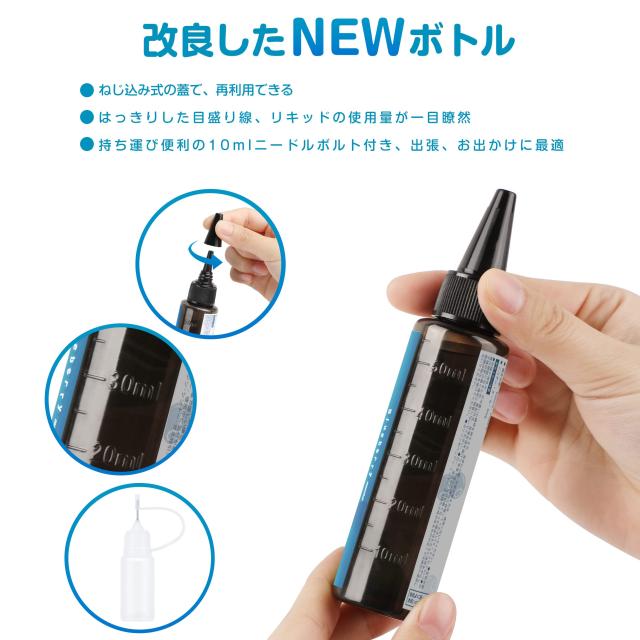 ★新たなリキッドボトルには見易い便利な目盛付きが刻まれている、リキッドの使用量が一目瞭然!