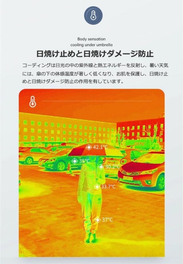 高密度ポリエステル素材を使用し、かつ防水性の高いテフロン加工を施された折りたたみ傘です。 内側の遮熱コーティングにより、日差しの強い日にも光を通さず紫外線を効果的にカットしてくれるので、暑い季節の通勤に日傘として活用可能です。