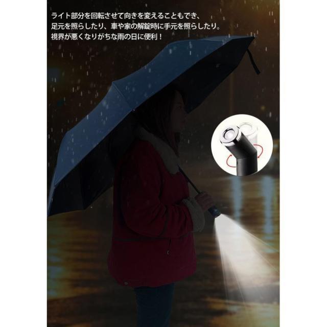 - 折りたたみ傘としては少し大きくて重量が重いけど、 雨降りの夜に使う際足元が明るく照らせるので、水溜りを踏まずに済みます。 普段鞄に突っ込むには重さがネックになるかな。 体を鍛える錘がわりと考えると良いかも。 個人的に、傘の取っ手が取り外せれば、単独でライトに出来るし、便利だと思う。ライトを使いたい時も傘全体を持つのは大きさ的に面倒で邪魔だから。 さらにライトはスマホ用の充電バッテリーも兼ねてたら最高なんだけどなぁ〜。