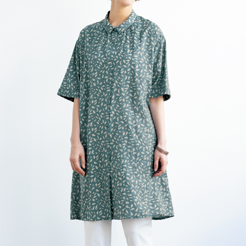 リーフプリントシャツチュニック ブルー ライトグレー チュニック シャツ 五分袖 レディース 婦人服 ミセス シニア 女性 青 総柄 葉っぱ柄 リーフ柄 ボタニカル柄 半袖 5分袖 シンプル シニアファッション 40代 50代 60代 70代 80代 90代 母の日 お母さん おばあちゃん 春物 夏物 春夏