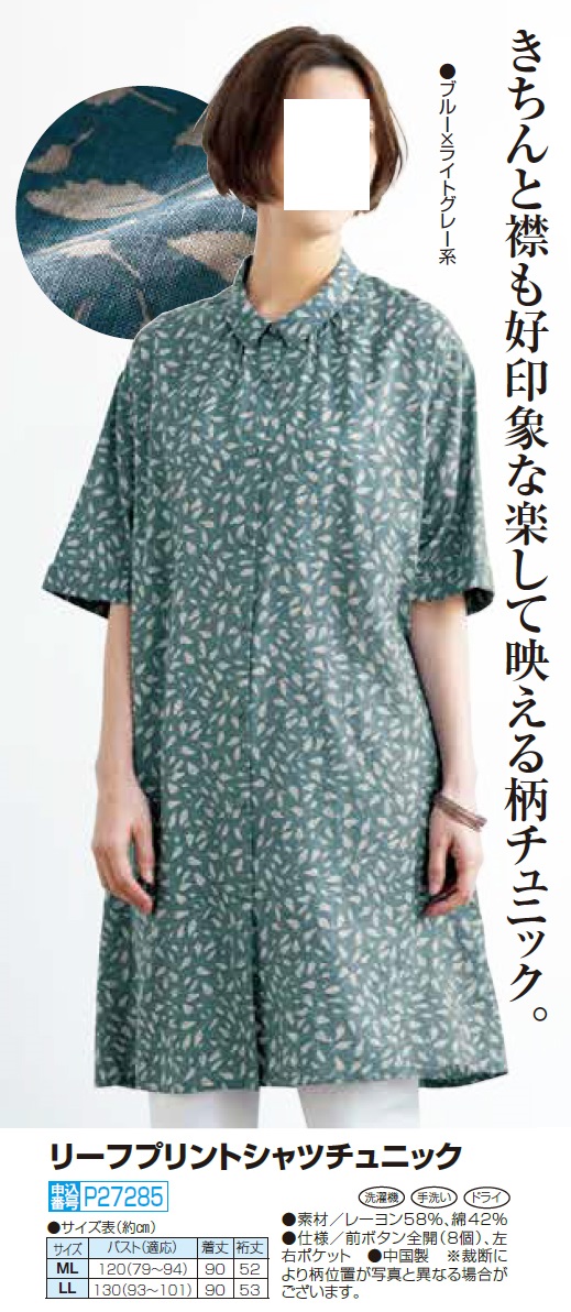リーフプリントシャツチュニック ブルー ライトグレー チュニック シャツ 五分袖 レディース 婦人服 ミセス シニア 女性 青 総柄 葉っぱ柄 リーフ柄 ボタニカル柄 半袖 5分袖 シンプル ファッション 50代 60代 70代 80代 90代 母の日 お母さん 春物 夏物 春夏 nss p27285