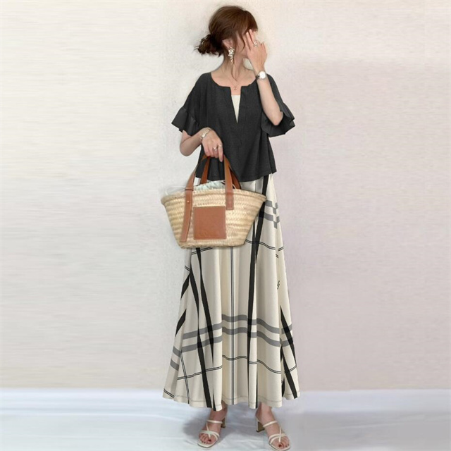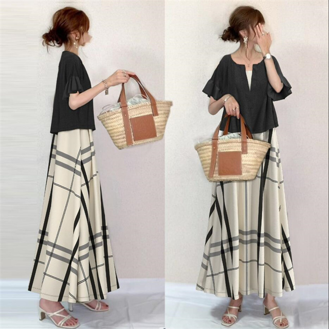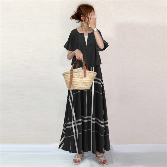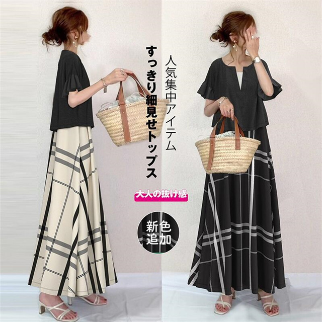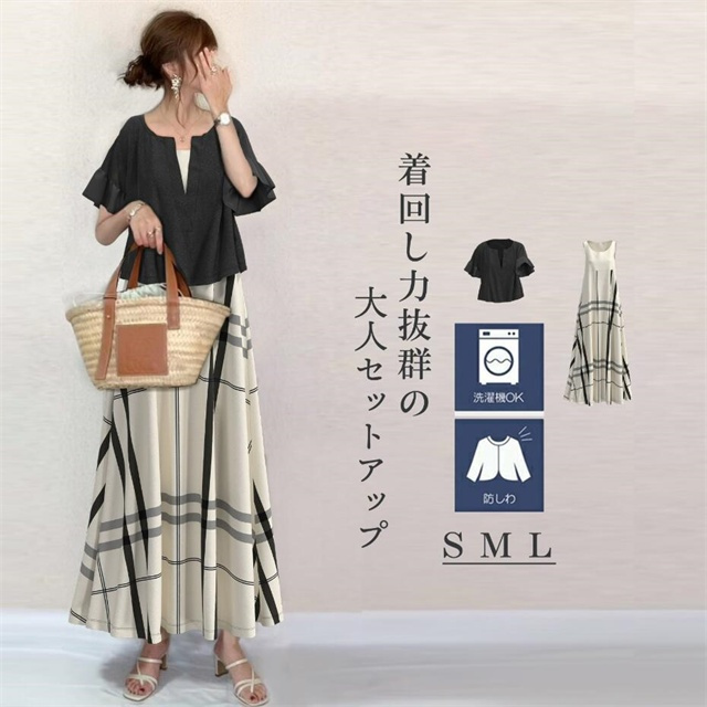 セットアップ 上品 レディース キレイめ オシャレ 2点セット 通勤 お出かけ お呼ばれ 旅行 上下セット 半袖+ワンピース 夏 新着 着痩せ チェック 送料無料