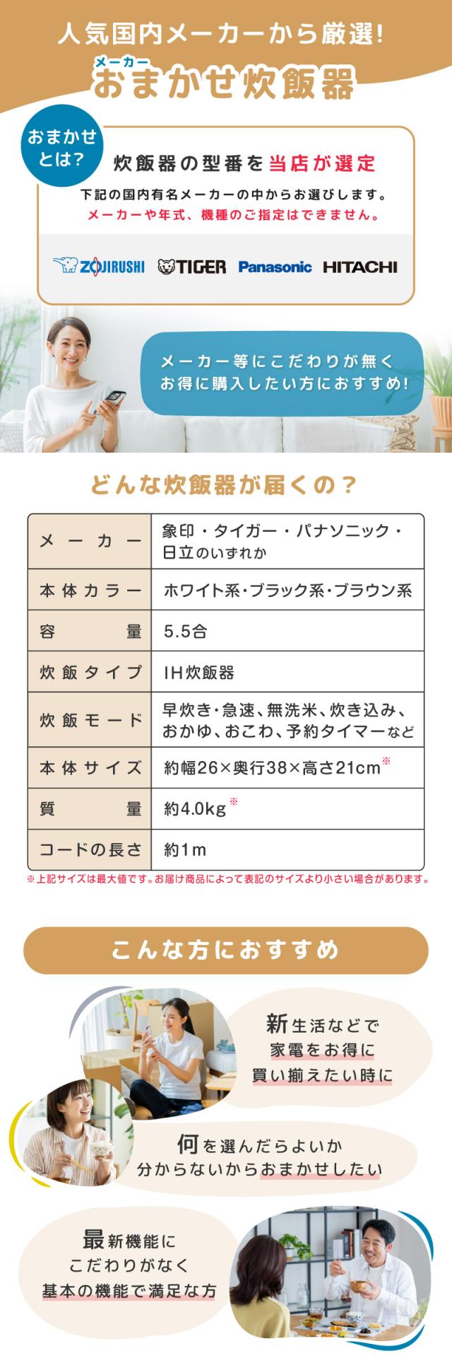 下記の国内有名メーカーの中から炊飯器の型番を当店が選定致します。