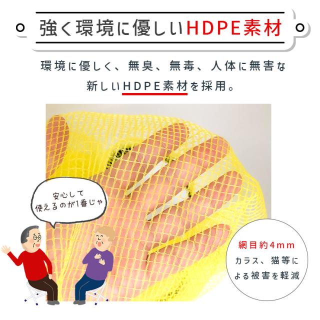 環境に優しく、無臭、無毒、人体に無害な新しいHDPE素材を採用。引っ張り強度にも優れています。網目は4mmと細かく、くちばしからも守ります。