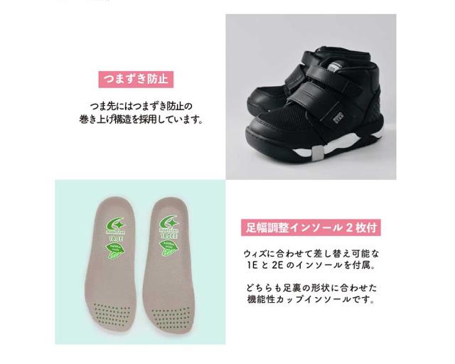 足幅が細めのお子様に向けたウィズ調整中敷(1E)付き。