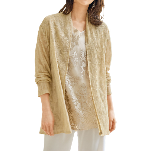 夏らしい波柄が浮き立つカーディガンは、ラメ入りニット素材。
