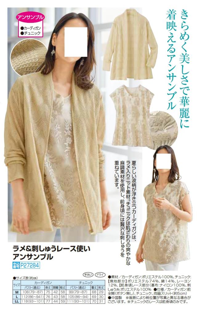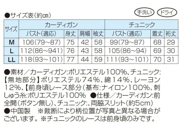 ●素材/カーディガン:ポリエステル100%、チュニック:【無地部分】ポリエステル74%、綿14%、レーヨン12%、【前身頃レース部分(基布:ナイロン100%、刺しゅう糸:ポリエステル100%