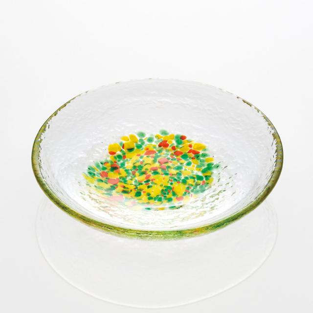 色彩豊かなガラスのつぶがきらめく、小さな硝子食器です。お菓子や箸休めにぴったりのサイズのお皿です。つるんとしたスピン成型なので、毎日使う器としてもぴったりです。