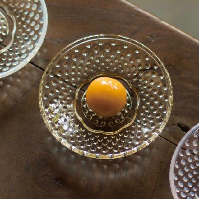 上から覗き込んで見た時につぶの並びは春先のぼたん雪、中央にはぽぽっと咲いた梅の花を思わせる穏やかな愛らしいデザインです。現代のくらしにアレンジされて、一粒、一粒光を受けて輝きます。