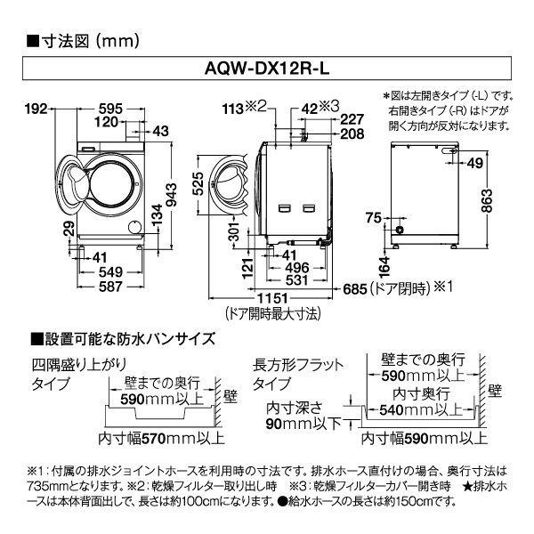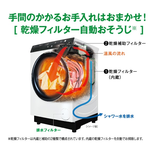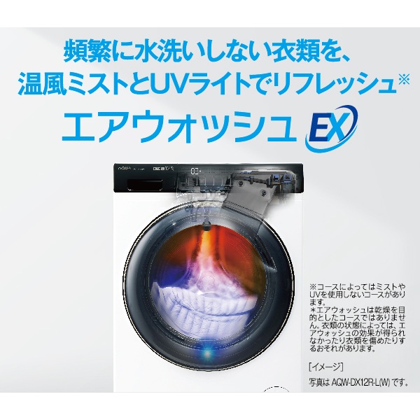 コンパクト&大容量12kg「まっ直ぐドラム」 泡のシャワーで洗剤を繊維の奥まで浸透「泡フルウォッシュ」 温風ミストとUVライトでリフレッシュ「エアウォッシュEX」 黄ばみをキレイに、除菌もできる「お湯洗いモード」 クラスNo1スピード洗濯「標準コース運転目安時間 約29分(洗濯時)」 ■容量 洗濯・脱水 12kg / 乾燥 6kg ■標準使用水量(定格) 洗濯〜乾燥時:約59L / 洗濯時:約84L ■水量 洗濯〜乾燥時 / 洗濯時:自動(負荷12kgで36L) ■標準コース運転目安時間 (50/60Hz) 洗濯〜乾燥時:約139分 / 洗濯時:約29分 ■定格消費電力(50/60Hz) 乾燥時:550W/洗濯時:240W/湯沸かし用電熱装置:640W ■消費電力量(50/60Hz) 洗濯〜乾燥時:1130Wh/洗濯時:55Wh ■運転音(洗い/脱水/乾燥) 約34dB/約45dB/約45dB ■総外形寸法(排水ホース含む) 幅595×奥行685×高さ943(mm) ■ボディ幅 595mm(ボディ幅) ■設置可能防水パン(奥行内寸法) 540mm以上 ■本体質量 約94kg ※記載は商品仕様の一部です。仕様説明不足等の理由での返品はできません。特に適合等は必ずご確認ください。